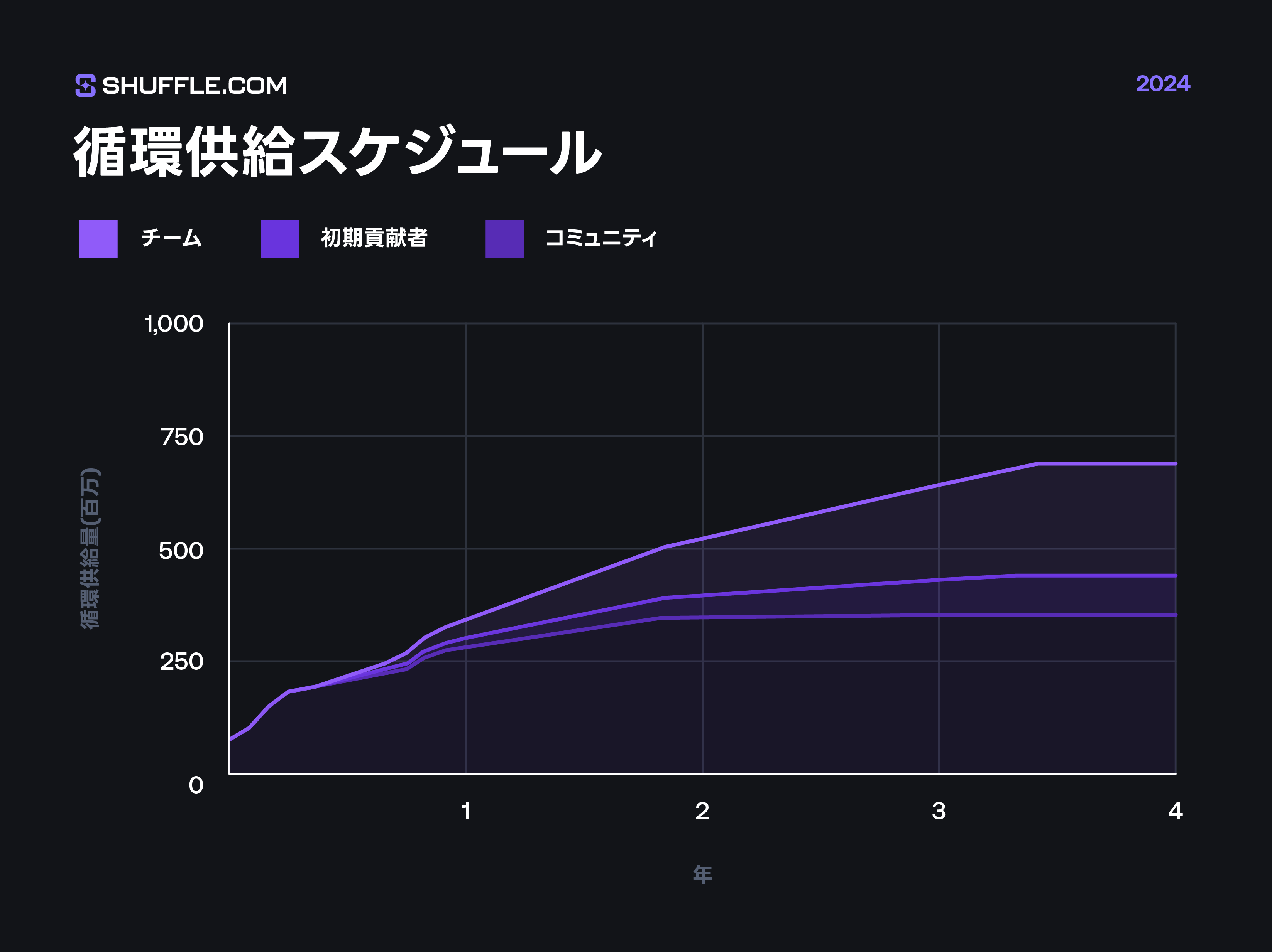 割り当てられたトークンは現在の Shuffle チーム メンバーに付与されており、割り当ては将来のチーム インセンティブのために確保されています。この割り当てには、6 か月のクリフとそれに続く 36 か月の\*直線的な権利確定のスケジュール（Linearly vest）があります。