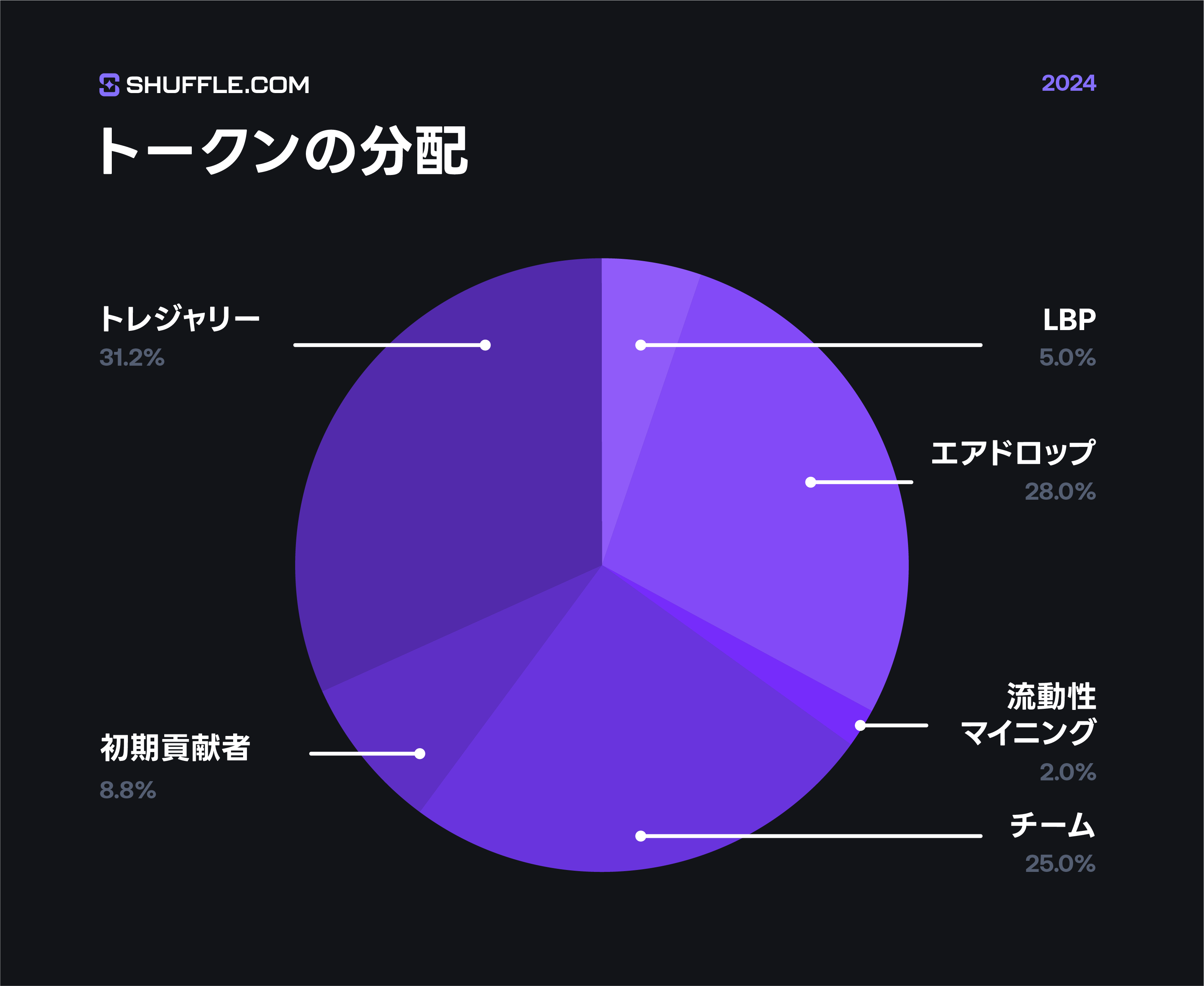 <figure><img src="https://894422262-files.gitbook.io/~/files/v0/b/gitbook-x-prod.appspot.com/o/spaces%2FQsl9iES8RnouiNOtHrNR%2Fuploads%2FshQ0Ehl0TiPOcnsX23hN%2Ftoken_allocation_jp.png?alt=media&#x26;token=e24fc775-3439-4d96-9d60-ce0410185fc3" alt=""><figcaption><p>SHFLトークンの分配</p></figcaption></figure>